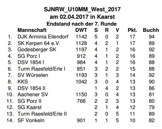 Am Sonntag 02.04 traten wir mit einer Viererjugendmannschaft zur NRW U10 Mannschaftsmeisterschaft in Kaarst an. Es handelte sích um eine von zwei zeitgleich stattfindenden Vorrunden dieser Veranstaltung. Die ersten Vier aus jeder Vorrunde qualifizierten sich für die Endrunde. Die andere Vorrunde fand in Gütersloh statt.
